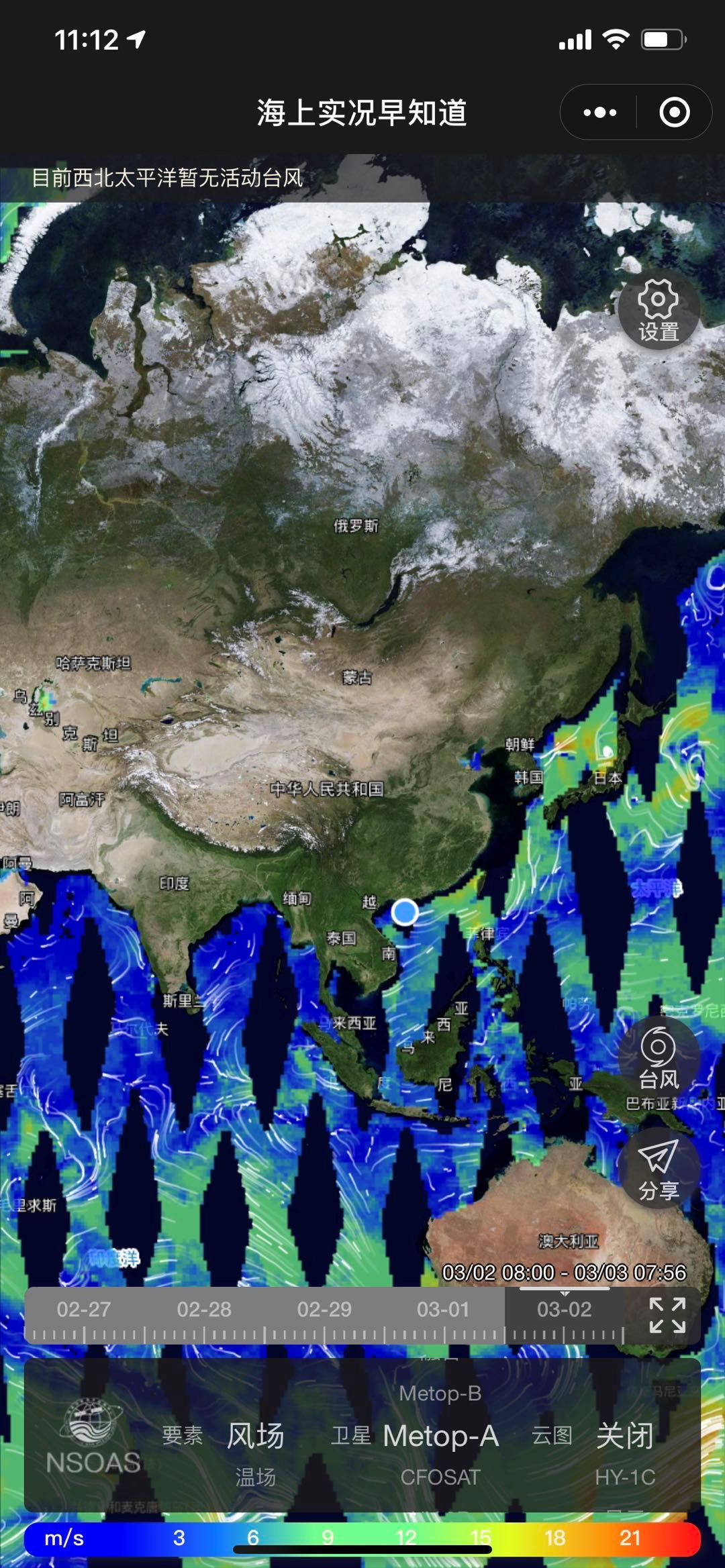 近日,由自然资源部国家卫星海洋应用中心组织研发的“海洋卫星遥感实况”微信小程序正式上线。只需在手机上动一动手指,就能随时随地获取全球任何海域每天的海面风场信息,足不出户就能查询某海域台风或气旋分布情况及近5天的变化过程。 ( I2 _; g+ e) N; z# o' W' s j