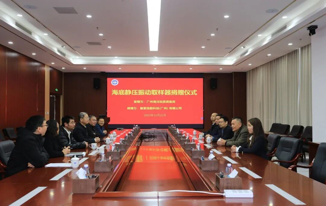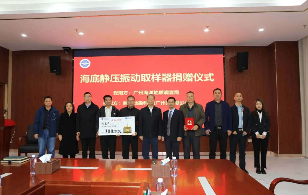 值此广州海洋地质调查局(以下简称:广州海洋局)成立六十周年之际,为促进新技术、新方法、新装备在海洋地质调查中的应用,也为感谢广州海洋局在近年来的关心和支持,磐索地勘科技(广州)有限公司(以下简称:我司)近日向广州海洋局捐赠一台价值300万元的“矢量者-4”型海底静压振动取样器,并于2023年12月21日在广州海洋局二楼会议室举行了隆重的捐赠仪式。 ]6 y# L+ C7 q# u% T: ~3 R4 _0 A