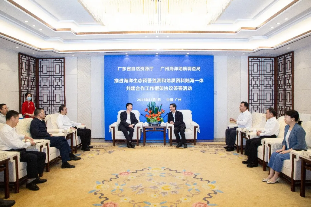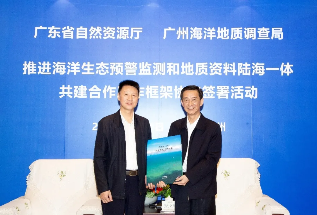 ( m1 q( F$ k* U4 n& ] 11月1日,广州海洋地质调查局与广东省自然资源厅在广州签署《推进海洋生态预警监测和地质资料陆海一体共建合作工作框架协议》。自然资源部党组成员、中国地质调查局局长李金发,广东省副省长张少康,共同见证协议签署。广州海洋地质调查局局长、党委书记许振强,广东省自然资源厅党组书记、厅长胡建斌分别代表双方签署协议。