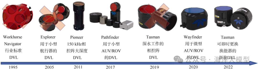美国的TeledyneRDI公司在全球范围内交付了4万余套多普勒相关设备,是行业领先的ADCP和DVL制造商,在民用领域和军用AUV领域占有率最高。针对宽带多普勒信号处理、相控阵设计、数据质量控制、系统自检等技术均为行业领先。其产品功能完善,技术革新迅速,目前在产4型号产品,其产品发展路线图如图1所示。
