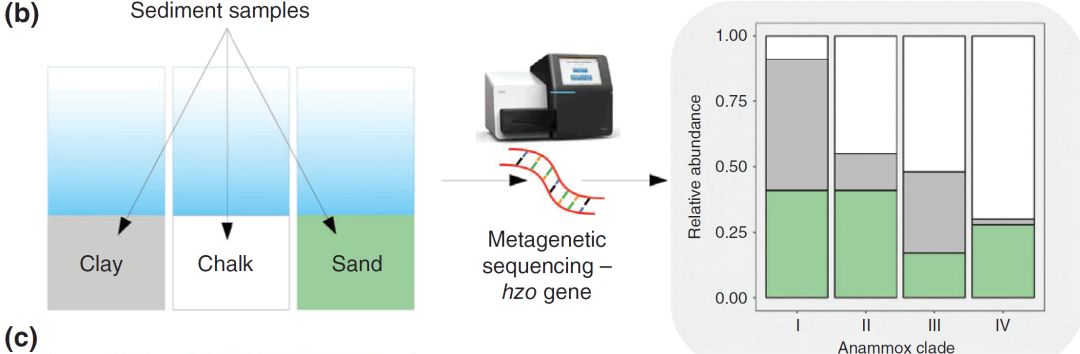 2 d( h6 t- f4 \) g( s* b7 Y- b# M' j Lansdown等人试图了解淡水流的基础地质是否影响厌氧氨氧化,以及厌氧氨氧化细菌的丰度和活动是如何支撑的。他们使用扩增子测序(图2b)研究了源自三种不同地质类型的沉积微生物 - 白垩,绿砂和粘土。在16S rRNA基因扩增子中未检测到已知的厌氧氨氧化细菌属,表明它们与其他细菌类群相比相对较少。然而,肼氧化还原酶基因(hzo; 厌氧氨氧化所需)的扩增子测序显示存在四种不同的厌氧氨氧化细菌进化分枝,其在不同的地质过程中相对丰度发生变化(图2b)。这些结果支持厌氧氨氧化过程速率的测量,并揭示厌氧氨氧化物是白垩地质中氮气损失的主要途径[2]。