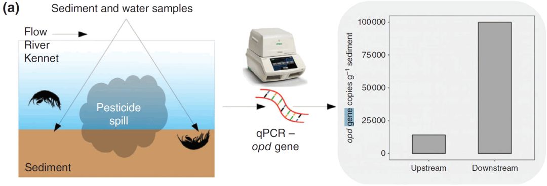 图2. 这里介绍的每个案例研究的图形摘要。(a)Thompson等人(2016)使用opd基因的qPCR分析表明相对于对照沉积物,污染沉积物中农药降解微生物的丰度增加了7倍。