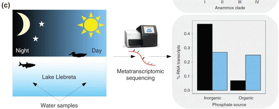 (c)Vila-Costa(2013)在进行了湖泊浮游生物的宏转录组测序, 他们发现磷酸盐摄取基因根据磷酸盐来源和一天中的时间差异表达。