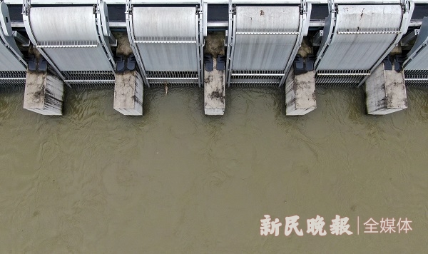 " v2 o! D7 u5 R' d! G$ U: U& l4 U( K 图说:淀浦河西闸管理站正在往内河泄洪 新民晚报记者 陶磊 摄(下同)