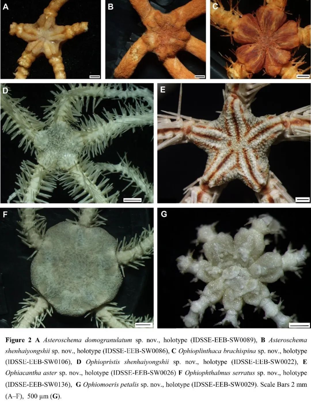 2 H5 U) |+ ~% x4 w 近日,中国科学院深海科学与工程研究所研究员张海滨团队及其合作者在南海及西北太平洋海域发现多个深海蛇尾新物种及新记录种,相关三篇研究论文分别发表在ZooKeys、European Journal of Taxonomy上。 M: D8 _9 W0 u# ^0 w