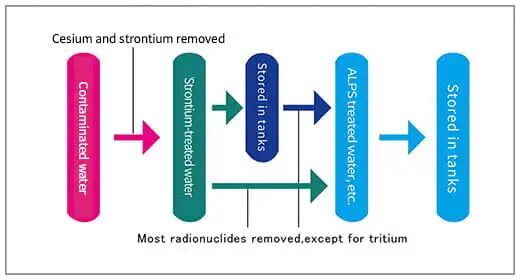 之后,东京电力公司开始将受污染的水泵入储存单元,并用先进液体处理系统(ALPS)处理,以消除大部分放射性核素。ALPS系统可以有效降低核废水中除氚元素以外其他放射性物质的浓度,使其满足法定排放标准(除氚元素以外的其他放射性物质浓度总量不超过1)。处理后的水储存在核电站场址中,处理水包括除锶水(Sr removed water)和ALPS处理水等(ALPS treated water, etc.)两种,除锶水是指水中的Cs元素和Sr元素被除去,ALPS处理水是指去除了除氚之外的其他放射性核素的除锶水。目前东电采用1046个1000立方米容量的贮水池储存ALPS处理水,已有超过一万吨的“处理水”被储存。 5 Q- {, R4 a2 l7 a* r