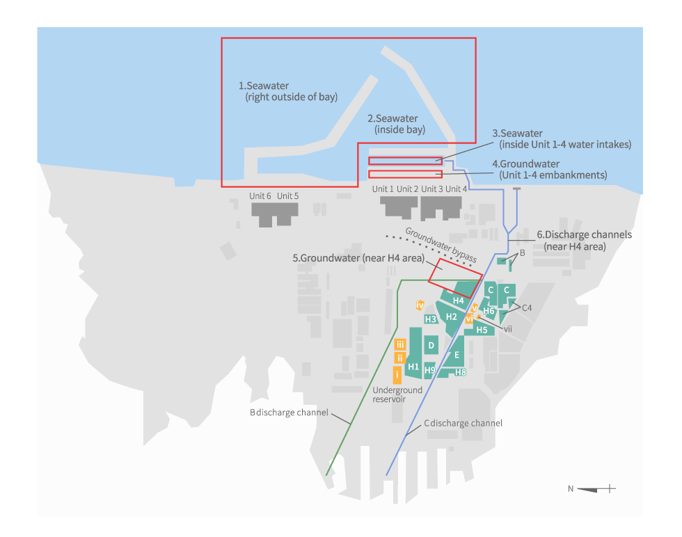 图 2 日本排海计划设施及放射性监测点位 z/ W/ a# p7 i" \( X5 Y