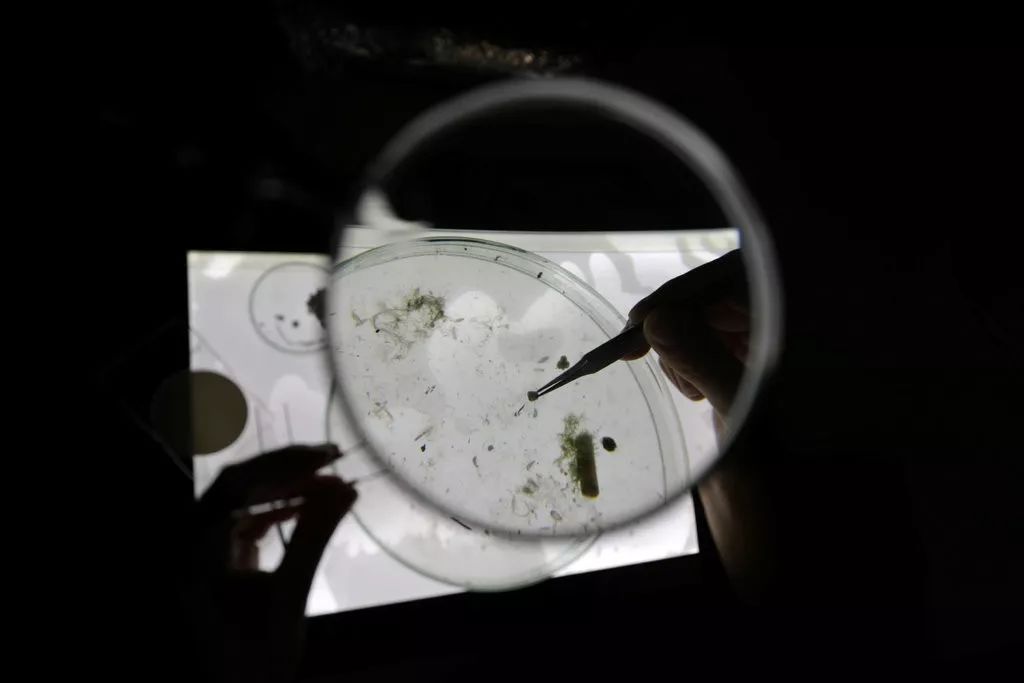 ▲科学家观察海水中的微塑料 图据纽约时报 / V: Z; u- L/ W# Q