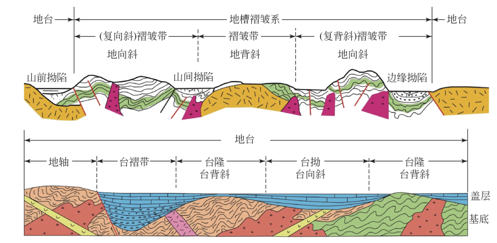 1 Z4 x% [3 S: }5 [) w6 x; Z: U 地槽区一般具有狭长的轮廓,经历过强烈的褶皱和断裂变动(图1),因而地貌的最大特点是长条状的、高耸的褶皱块山脉和山系,高差极度悬殊的高山、深谷和盆地。高山强烈地进行冰川和重力作用,河谷下切。