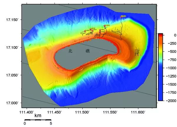 / O# ^& I" a; ?6 V+ m% y6 ` 如前所述,此次南海海域深海考古调查系首次开展,具有较强的探索性。在纷繁的头绪中如何确定工作范围是首当其冲的一个问题。迄今为止,西沙海域共登记有106处水下遗存,是南海海域水下文物资源分布的密集区域,北礁占比三分之一,其中又以北礁东北缘数量最多。从已有成果看,晚唐五代以来的水下遗存在这片海域都有发现,北礁是南海海域中外交通的重要航路节点。实际上,这种状况也与魏晋南北朝以来南海航路自北部湾逐渐绕行海南岛东侧过西沙群岛这一重要的海路变迁相互关联。因此,2018年南海海域深海考古调查选定北礁东北缘对应的深海区域作为实验海域(图二)。