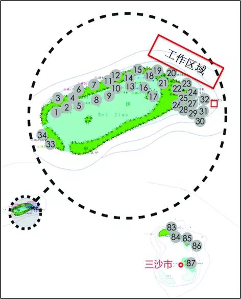 # v' x' I0 G4 v. v ▲ 图二 北礁水下遗存分布与工作区域示意图