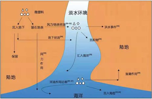 陆源的输入是海洋环境中微纳米塑料的最主要的来源,目前对全球海洋中塑料垃圾的来源进行估计,普遍认为陆源大约占80%。由于微塑料颗粒尺寸较小,进入污水处理系统的不同来源的微塑料(日化制品、工业生产以及纺织纤维脱落)很难有效将其过滤去除,最终导致大量的微塑料颗粒被排放到海洋环境中。另外一个陆源的输入途径就是含有微纳米塑料的土壤通过侵蚀或流失进入海洋环境之中滨海旅游业和船舶运输业导致大量的塑料产品和废弃物进入海滩或海洋中,这也是海洋塑料污染增加的另一主要原因。 ! [: T8 O7 Z. \2 V6 }2 [