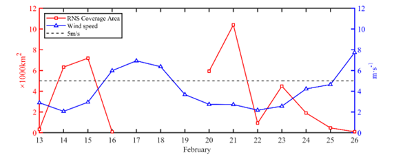 . k* {, F/ ]( k7 a 针对这一科学问题,谢奇伶、杨雪、高瑞超、陈新龙、吴泓璟组成大创项目团队,在赵俊教授和研究生严楠洋的指导下,基于夜光藻的光谱特征(图2),利用多源卫星遥感数据,绘制了赤潮斑块的空间范围,最大程度地展现赤潮的发生和发展全貌。卫星图像显示,2021年2月13日至26日间,北部湾夜光藻赤潮总覆盖面积超过20,000平方公里。大面积的夜光藻赤潮斑块在2月17日突然消散,并于2月20日再次出现。结合遥感数据和数值模型结果,对夜光藻赤潮的爆发机制进行分析,表明这次赤潮事件与粤西沿岸流西向输运和外海垂向输运产生的营养盐有关,其生消过程与SST、aph(443) 的变化有关(图3),赤潮斑块的分布面积与风速之间存在一定的负相关关系(图4)。本研究有助于进一步认识北部湾夜光藻赤潮的生消机制,对北部湾赤潮的防灾减灾、预测预警以及生态修复和环境保护具有重要意义。