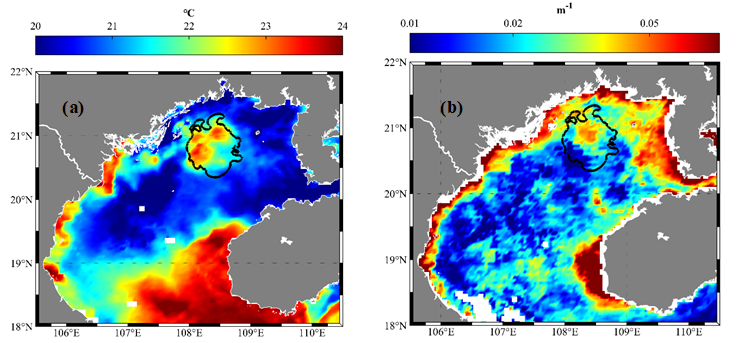 图3 夜光藻赤潮(黑色实线)爆发时SST(左)和爆发前aph443(右)的空间分布