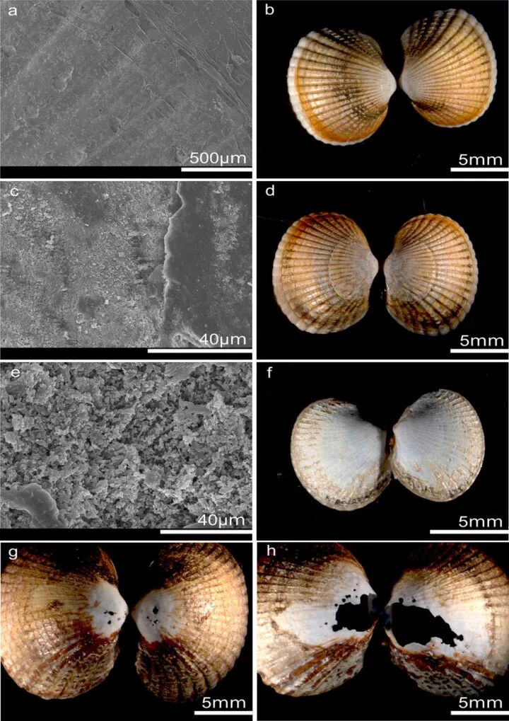 电显镜显示的贝壳被酸化的损伤程度