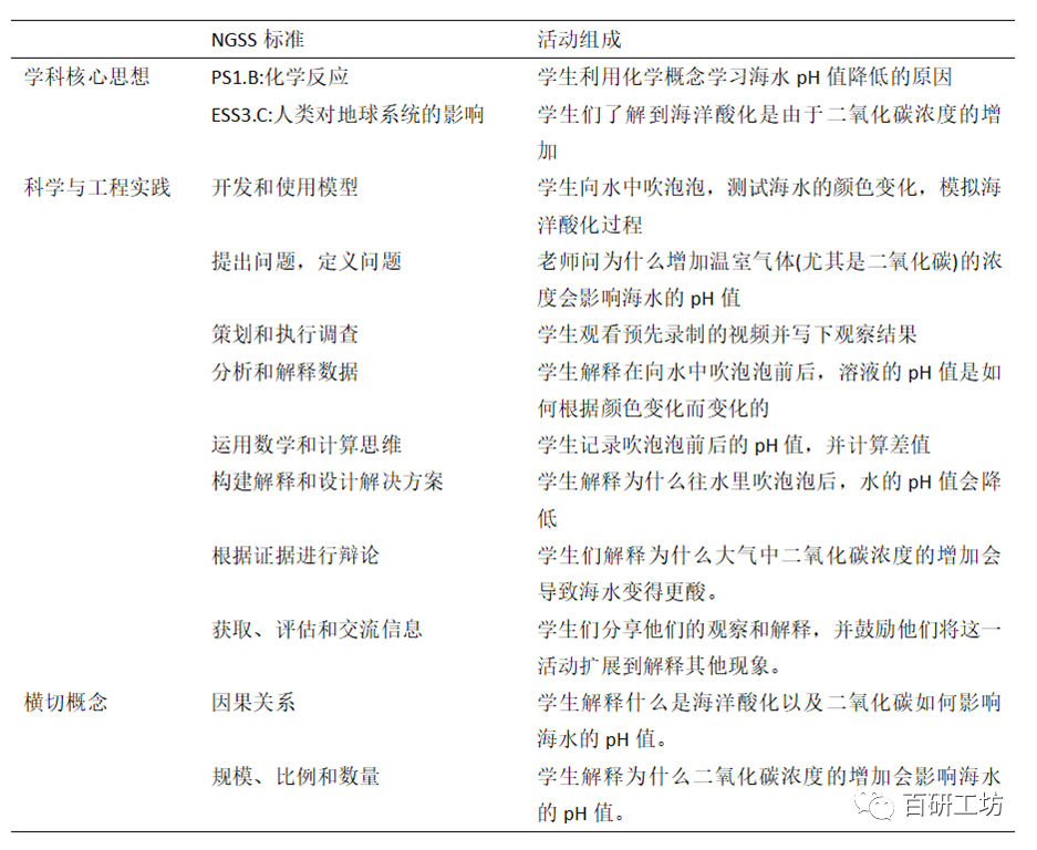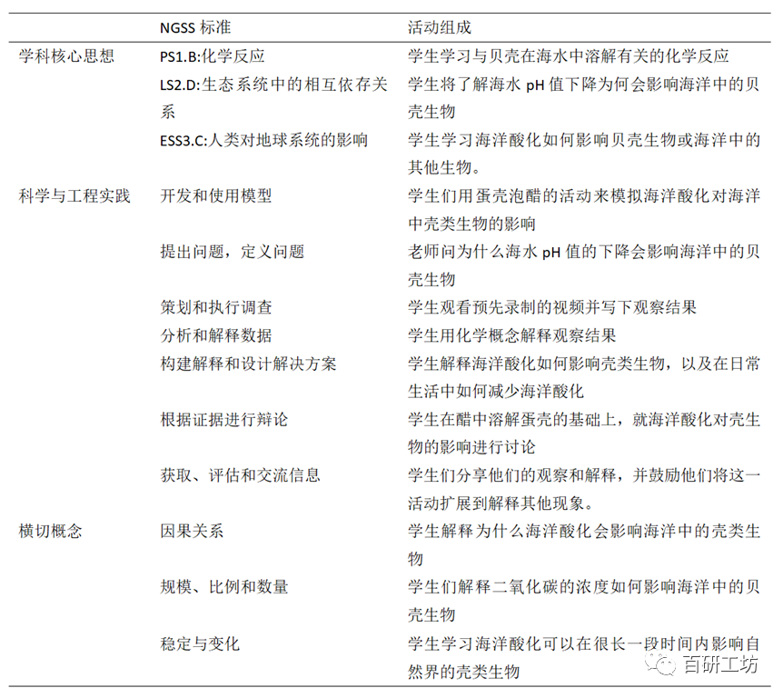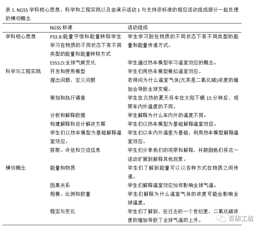 在整个气候变化项目中,学生们在三个示范活动中展示了NGSS和三维框架的使用:在示范活动中可以引入哪些学科核心思想,涉及哪些科学和工程实践,解决了哪些横切概念,以及如何在活动中解决具体问题。 ) E' o; I$ M* v) M0 v& x