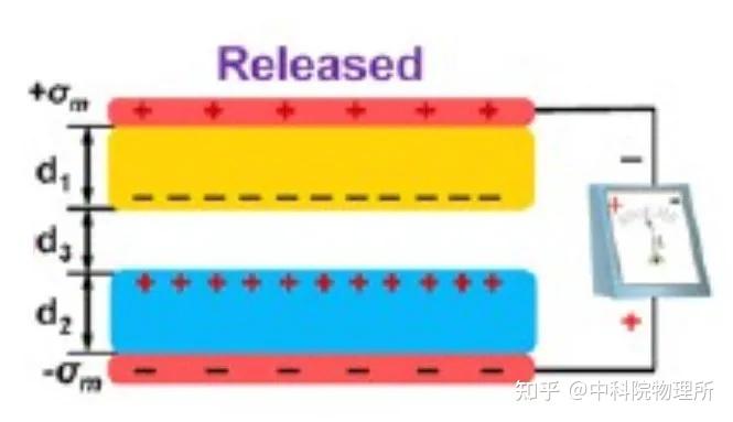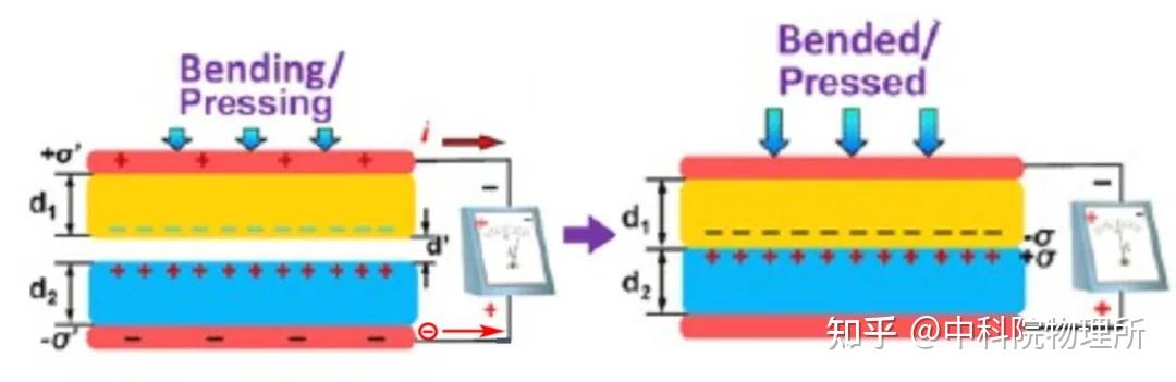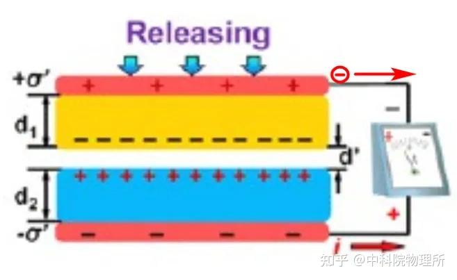 当外界压力被释放的时候,两者分开,为了保持各自电中性,小黄会将电子通过外电路传输给小蓝,形成前半周期的电流。
