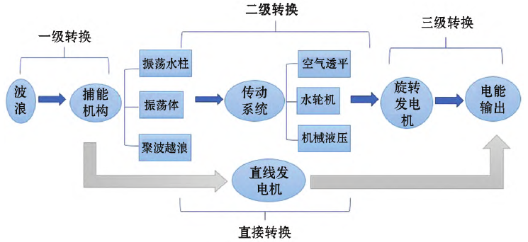 波浪能从捕获到发电一般经过三级能量转换,一级转换为波浪蕴含的能量通过捕能机构在波浪下的运动转换为传动系统所需能量;二级转换为将捕能机构捕获的能量通过传动系统转换成发电机所需的能量形式;三级转换为通过发电机等设备将能量以电能形式输出。