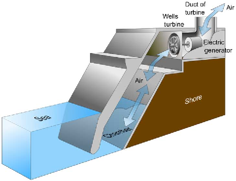 “振荡水柱式”是一半浸在海水里的中空设备,设备罩住一部分的海面,被罩住的海面随波浪上下振荡,波浪产生时,在发电系统内被罩住的海水会作上下垂直运动,进而推挤密闭舱内的空气然后带动涡轮机发电;代表装置是苏格兰研发建设的“Islay LIMPET”,Islay LIMPET是世界上第一台商用波浪发电设备,并已连接到英国国家电网。