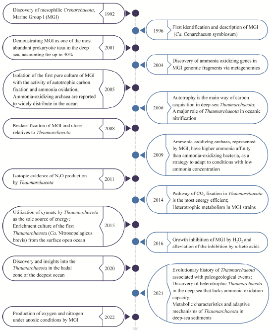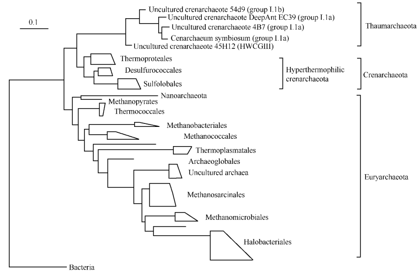 Woese 等在 1977 年提出古菌域时,古菌仅由泉古菌门 (Crenarchaeota) 和广古菌门(Euryarchaeota) 2个门类组成,前者主要包括在热泉中发现的嗜热类群,而后者则以嗜盐古菌和厌氧的产甲烷古菌为主要代表。由于这些微生物的生存环境与早期地球环境类似,因此得名古菌,且古菌一直被认为只生存于类似极端环境中。1992 年,古菌所属 16S rRNA 基因序列在近岸和深海水体中的发现颠覆了上述认知,使人们意识到古菌的物种多样性远超以往所知。这些从有氧、温度适中的海水中发现的古菌序列在进化树上形成了 2 个单系进化分支,代表了一个新的古菌门,即奇古菌门(Thaumarchaeota)。