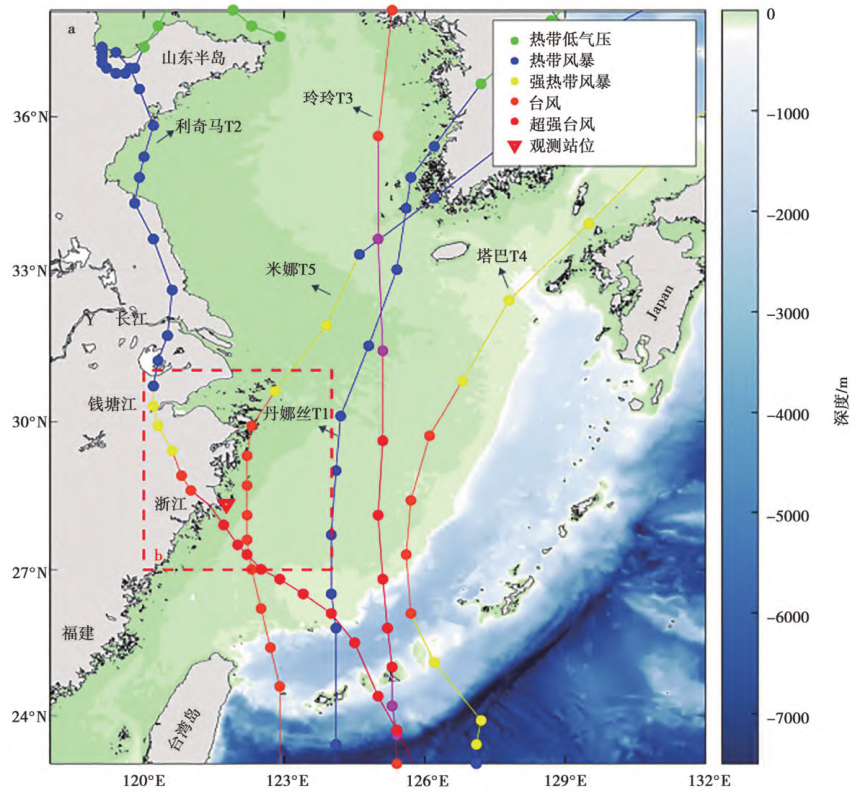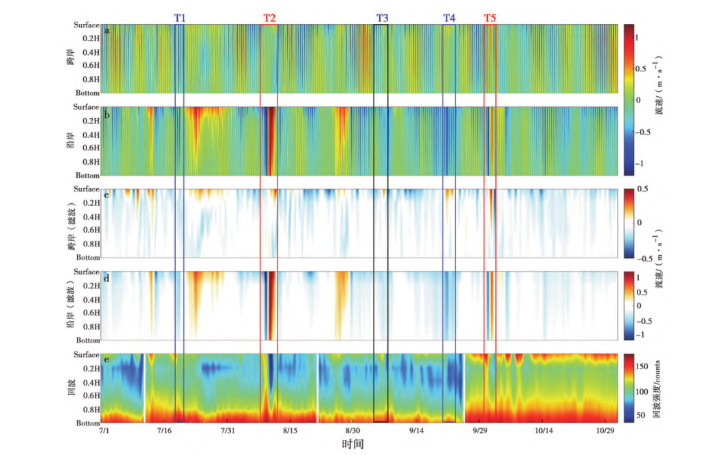 极端天气事件下的水体监测的设备观测仪器为AWAC,即声学多普勒波浪剖面流速仪等。该设备是从底部向上发射声波,从而实现观测站从海底到海表水体的监测。观测期间成功捕捉到了五次台风的影响过程(见图5),分别为台风丹娜丝(T1)、台风利奇马(T2)、台风玲玲(T3)、台风塔巴(T4)、台风米娜(T5)。座底设备的横向摆动幅度与纵向摆动幅度均小于10°,说明观测期间仪器基本稳定,观测数据较为可靠。 * D- i# b c" T8 p: V; b3 J