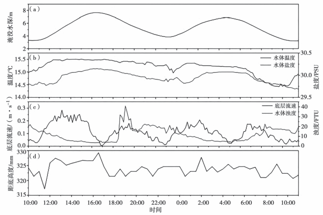 2 ^6 d8 @0 Z) V& b 图2 观测期间海底冲淤实时监测图(a)(b),距底深度频率分布图(c) [0 q6 a/ ~# g5 q0 I- i. q