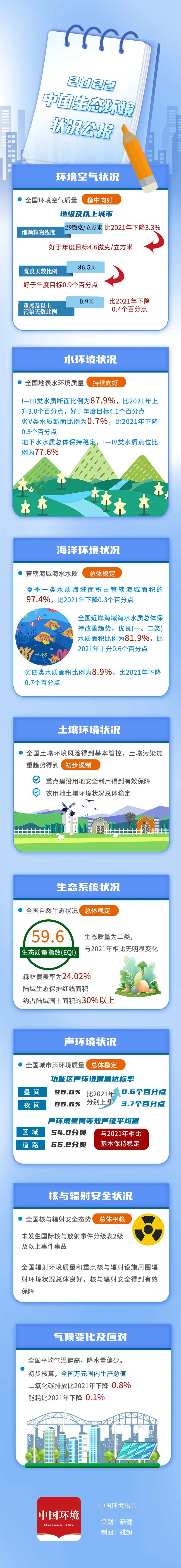 . y/ I) n; {4 n 2023年5月29日,生态环境部召开新闻发布会,发布了2022年中国海洋生态环境状况公报,针对1359个国家海洋水质监测点位开展的监测结果显示,2022年我国海洋生态环境状况稳中趋好。近岸海域海水水质总体保持改善趋势,优良(一、二类)水质面积比例为81.9%,同比上升0.6个百分点,劣四类水质面积比例为8.9%,同比下降0.7个百分点;管辖海域海水水质总体稳定,夏季符合一类标准的海域面积占比97.4%;综合治理攻坚战三大重点海域(渤海、长江口-杭州湾、珠江口临近海域)总体年均优良水质面积比例为63.0%,同比上升0.5个百分点。