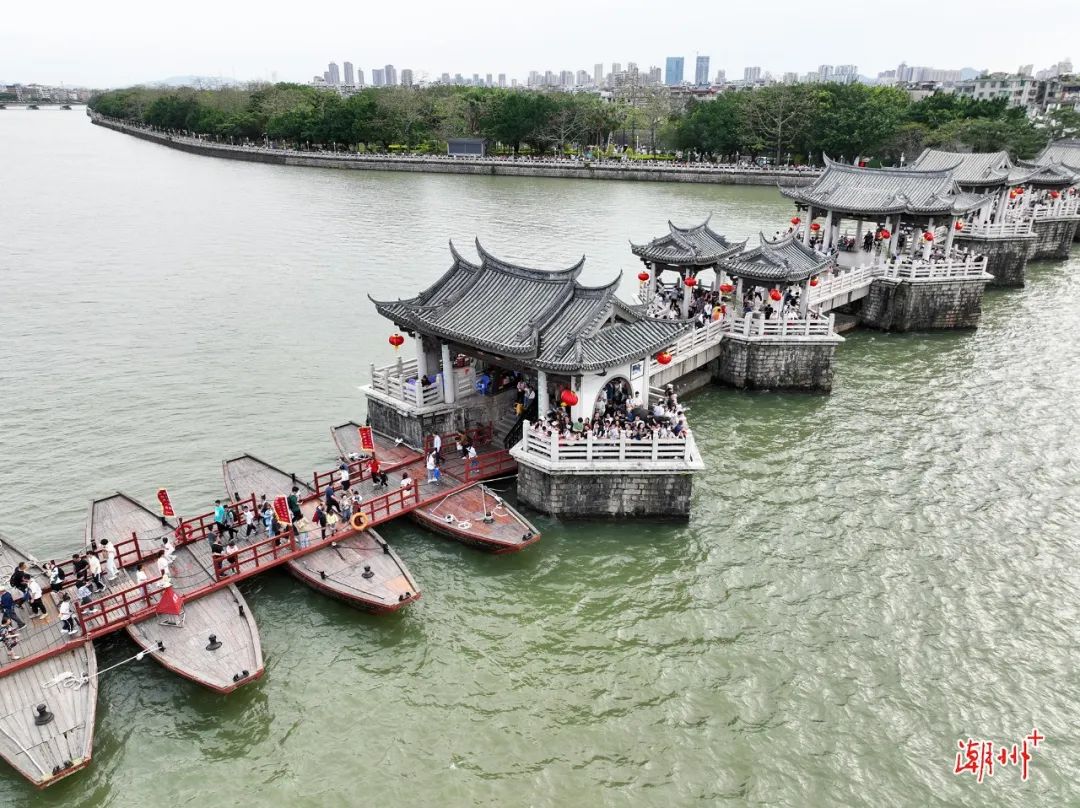 " K1 `% N3 U- y; ^$ p 漫步广济桥看桥上亭台楼阁古朴典雅 一江两岸美景尽收眼底不少游客慕名而来感受这座千年古桥的独特魅力……始建于南宋乾道七年(1171)的潮州广济桥,是潮州文化的历史地标、全国重点文物保护单位。2007年古桥经全面修复开放后,重展明代全盛时期“十八梭船廿四洲,廿四楼台廿四样”的独特景象。如今在现实中还延续广济桥“一里长桥一里市”的历史风貌,实现古桥活化与非遗展示的完美结合。2020年,潮州广济桥活化利用项目成功入选“广东省活化利用典型案例”,这是潮州推进历史文化遗产保护工作的体现。近年来,潮州牢记嘱托、感恩奋进,全力做好历史文化传承保护工作,深入挖掘历史文化资源、保育活化历史文化街区、传承保护文化遗产、推动古城文旅融合发展,让千年古城留住乡愁,让文化瑰宝绽放出更加迷人的光彩。 9 h) p' m+ I' M6 D% }* |7 b