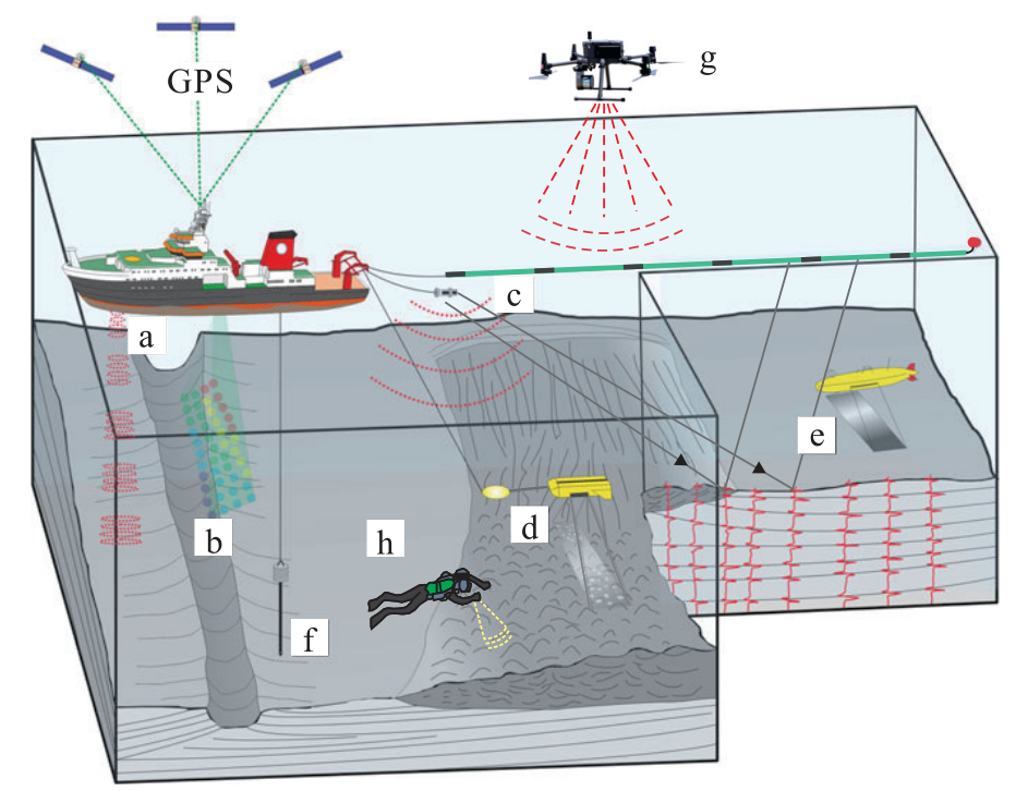 ' U: k# q& F+ M# I* G a:浅地层剖面仪,b:多波束测深仪,c:地震系统,d.侧扫声呐系统,e:AUV,f:沉积物取样器,g:无人机激光雷达,h:人工潜水挖掘