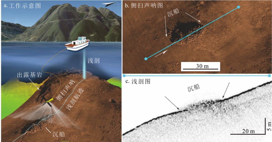 a:侧扫声呐和浅地层剖面系统的基本工作原理示意图;b:拖曳于调查船尾的侧扫声呐换能器发射垂直宽扇形高频声脉冲扫描海底,海床反射脉冲(背向散射)被记录并处理,生成海床和沉船高精度侧扫声呐地貌图像;c:船载浅地层剖面系统沿垂直方向发射垂直窄波束高频脉冲,海底和更深层的反射声脉冲被记录和处理,生成海底和沉船浅地层剖面图像