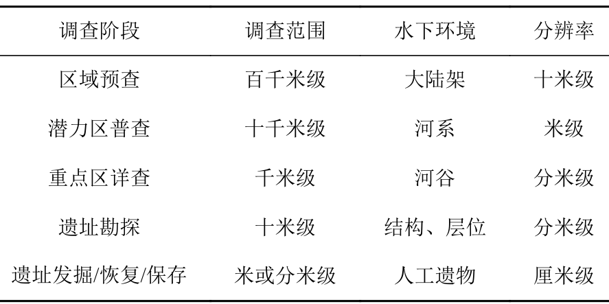 表1 水下考古调查的不同阶段及其规模、水下环境及相应分辨率