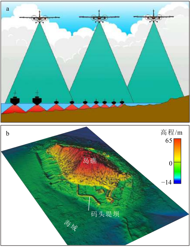 a.机载激光雷达测深效率是调查船声学测深的数倍,b.海南东锣岛多波束测深和LiDAR测深数据融合一体成图 7 V: b3 V* M" O8 k