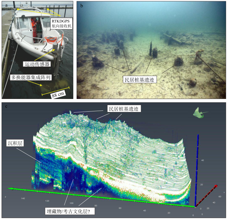 ! \# r) W4 H7 s. \/ Q a.安装在小型调查船上的SES-2000quattro参量三维浅剖;b.水下摄影显示的居民桩基遗迹;c.三维浅剖数据揭示民居桩基遗迹(b)、沉积层、埋藏物、考古文化层 & f/ X7 X$ d" {9 Q) l
