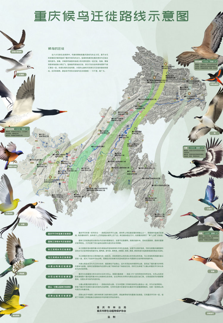 0 C1 M: P p) Q$ C7 M4 n 11月2日,重庆市林业局首次发布《重庆候鸟迁徙路线示意图》,图文并茂标示出猛禽、水鸟等候鸟迁徙通道,并揭秘重庆迁徙候鸟的“档案”。 $ j6 I9 l# I" a, {. f# K& r
