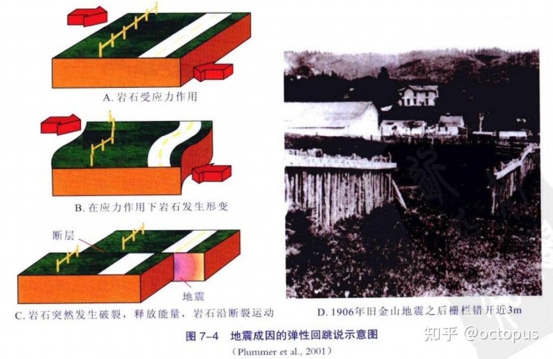 ①地震成因分类: 构造地震:由地下岩石突然发力错断引起。地球约90%的地震和破坏性大的地震都属构造地震。具体原理见下图。弹性回跳学是应用最广的地震成因假说。比较形象的比喻是两只手掰筷子,作用与筷子上的力就是积蓄的应力,筷子掰断的瞬间释放的能量就是地震能量的来源。这一假说可以较好的解释浅源地震,但对于岩石已具有塑性的中、深源地震无法解释。火山地震:火山爆发时气体冲击力所引发的地震或者火山喷发时地下岩浆、气体状态变化产生地应力分布变化引起构造变动、发生地震。冲击地震:由山崩、滑坡引起,或喀斯特地貌区地下溶洞洞顶塌落引起,也发生于煤矿等矿井采空区塌落。②震源深度分类