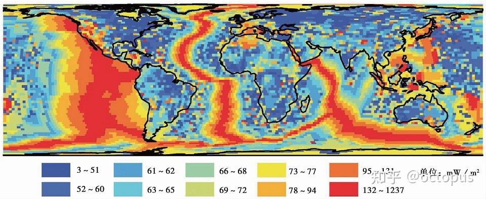 : Z M6 @. h6 z. S4 { ②在海洋中,洋中脊地热流值最高,而距离洋中脊最远的海沟地热流值最低;