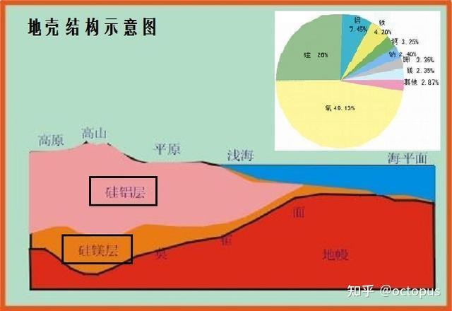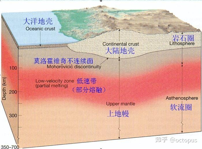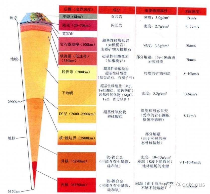 ) ]* m4 T0 A( Z7 S( t0 t( A9 Z 地理试卷见过无数次的图莫霍面:在地下平均33km处(大陆深、大洋浅,详见上文“均衡原理”),横波(S波)和纵波(P波)速度出现急增。该不连续面称莫霍面,其以上为地壳,以下为地幔。古登堡面:在地下平均2900km处,纵波(P波)速度锐减,横波(S波)完全消失。该不连续面称古登堡面,其以上为地幔,以下为地核。b.地壳(A层)