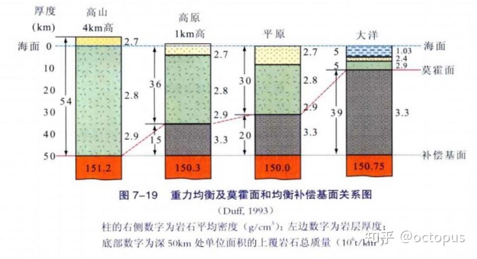原因是虽然高山高原的地壳厚,但是它下面的莫霍面很深,也就是说从高山高原地区的地表到补偿基面,大部分是密度较低的地壳,莫霍面以下密度较大的地幔比较少(地球密度随着深度的增加而增大); 8 _: F& q! \5 i( F+ c. `, |