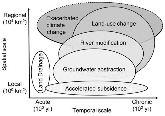 4 P( x0 t b7 W+ a4 J' B8 q/ Q: k 海水入侵的人为活动驱动因素包括:土地排水、海滨淡水层抽水、大坝建设导致的淡水流量减少、水流改道、水文结构与流域土地利用变化等。文章详细阐述了人类活动导致的气候变化及自然环境改变与海水入侵之间的关系。