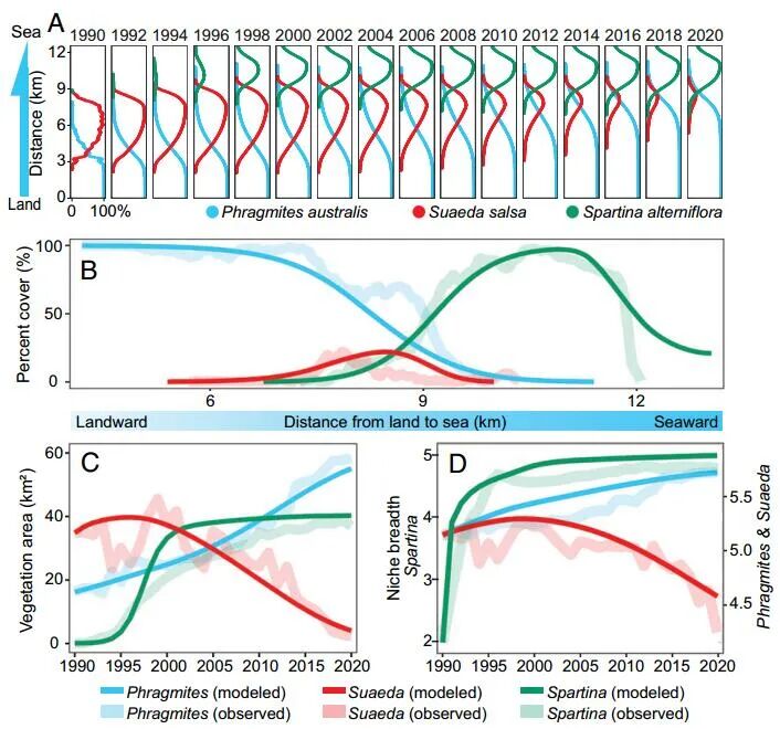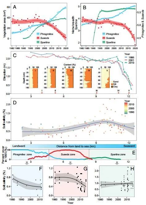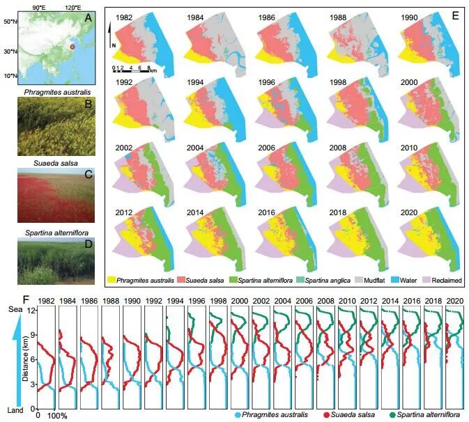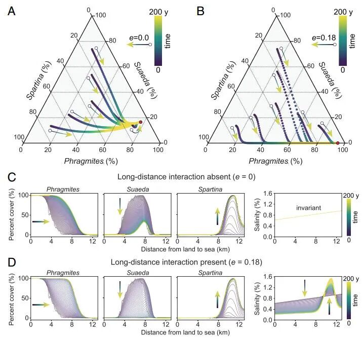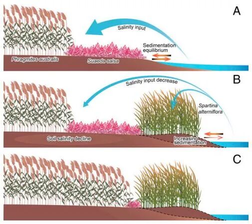 1 _( F" F7 Z$ H: a/ W. Q  生物相互作用通过驱动生态和进化过程,在空间尺度上分层组织生态系统,在生物圈中无处不在。生物相互作用已在局部和全球尺度上进行了广泛研究,但在中间景观尺度上的长距离、跨生态系统相互作用如何影响生态系统的结构、功能和恢复力仍然知之甚少。 该文章的作者们使用遥感、建模和实地数据来检验入侵物种的远距离影响,显著影响东亚最大的潮滩生态系统之一的假设。研究发现,外来 Spartina alterniflora 的入侵可以对最远 10 公里外的本地物种产生远距离影响,从而推动海岸生态系统的年代际转变。低海拔的侵入性软草促进了高海拔原生芦苇  hragmites australis 的扩张,导致中间海拔标志性的 Suaeda salsa “红海滩”沼泽的大量损失和复原力降低,这主要是由于整个土壤盐度降低景观。 该文章的结果说明了长距离相互作用在塑造景观结构和生态系统恢复力、以及弥合本地和全球生物相互作用之间的差距方面可以发挥的复杂作用。