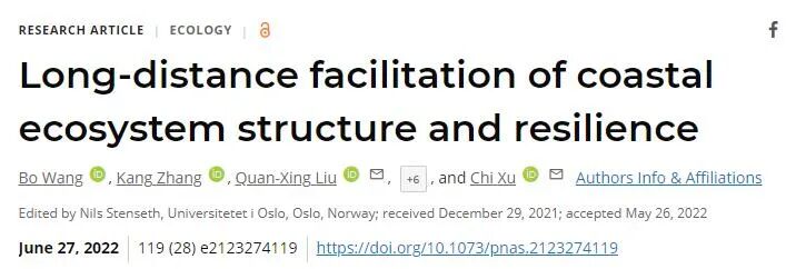 & e" d W. k. t% w/ H3 B4 V Bo Wang, Kang Zhang, Quan-Xing Liu, et al. Long-distance facilitation of coastal ecosystem structure and resilience. PNAS, 2022, 119(28): e2123274119.
