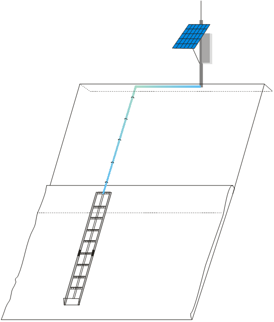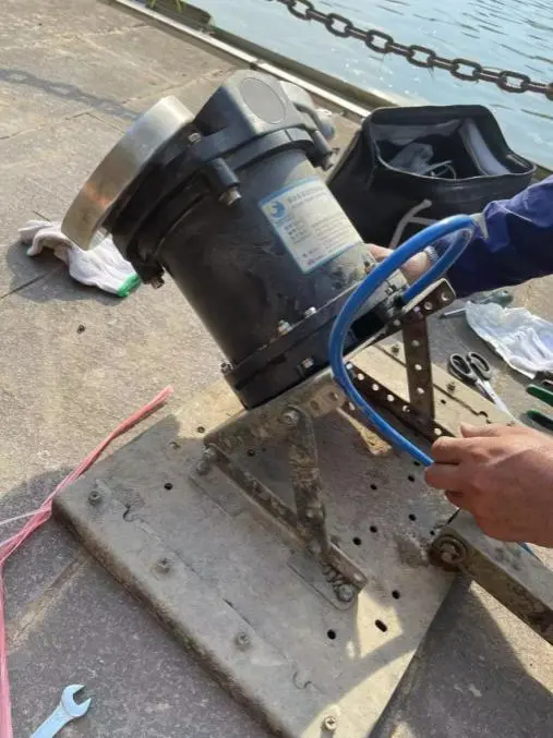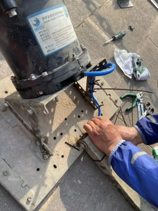 斜轨安装板原有孔距为正方形14cm,设备实际孔距为正方形13.5cm,与水文站领导协商后按实际孔距钻孔后安装。斜轨安装于河堤,斜角角度为28度,将安装板调整为60度入水,设备线缆由拉杆下方右侧孔道穿入,由于线缆有部分向上露出安装支架,在线缆插头和设备固定板之间缠绕多圈胶带防止插头被意外拉出,其余部分由扎带固定于安装板上。