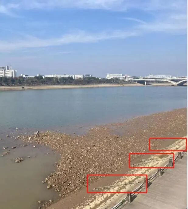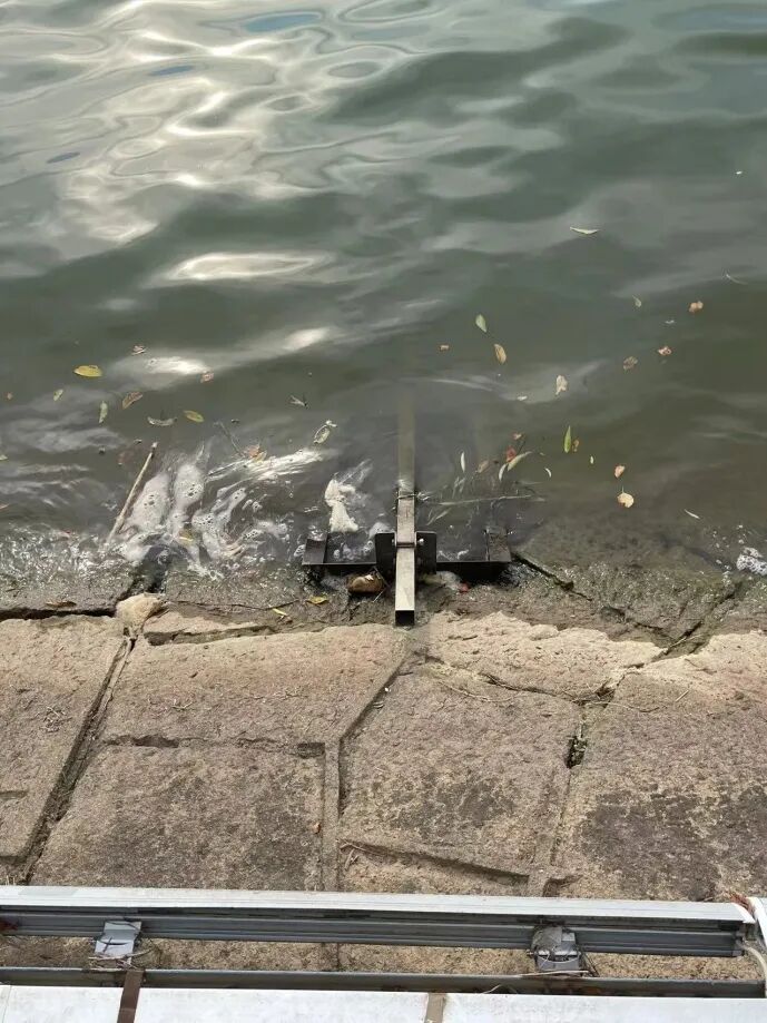 斜杆处于河堤斜坡处,地形为浅滩,高程较高,下游水库放水后斜杆会露出江面。(询问得知需下方水库检修才会造成此现状,近三年仅有一次)