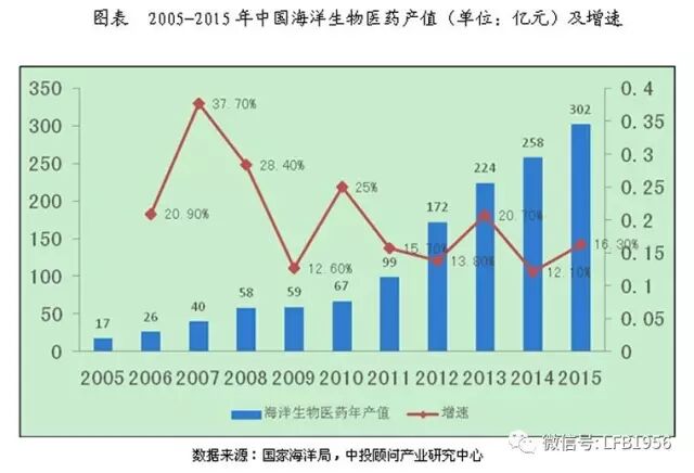 据预测,“十三五”期间,中国海洋生物医药行业五年复合增速将在25%-30%区间内,2020年中国海洋生物医药行业产值可达1100亿元。