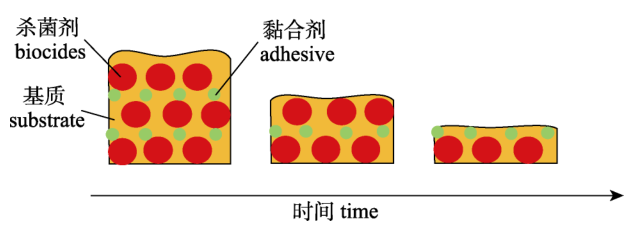 ⑵自抛光共聚物涂料20世纪60年代,人们基于丙烯酸或甲基丙酸共聚物发明了在海水中易于水解的自抛光共聚物涂料。这些共聚物作为基质与杀菌剂和黏合剂混合形成涂层,通过黏合剂控制杀菌剂的浸出速率(图2)。随着涂层中的树脂在海水中水解,杀菌剂被缓慢释放,先锋细菌、藻类孢子和无脊椎动物的幼虫等无法在涂层区域聚集,显著抑制了生物附着现象的形成。