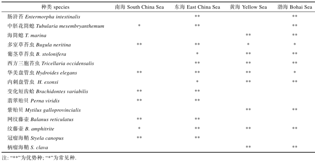 表1 我国四大海区主要附着生物种类