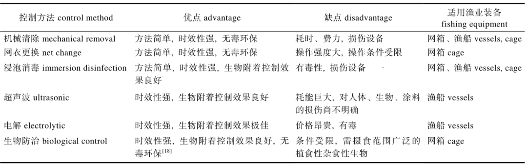 6 d1 K1 M" ~0 F+ _9 l 主动控制方式主要包括机械清除、网衣更换等方法,其优缺点和渔业设备适用情况如表3所示。