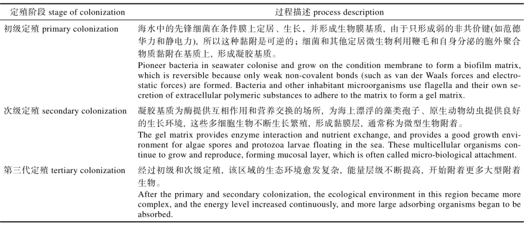 % z6 V& O, b% T 表2 附着生物定殖过程 / T" Y1 ~. d0 r# x, O1 ~" P