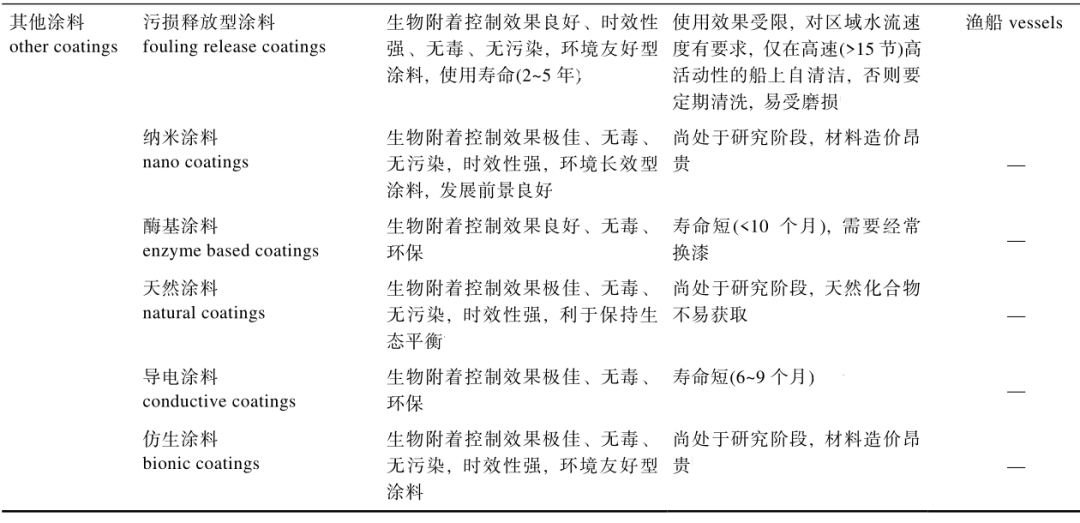 % O: X M# B, A 被动控制方式以涂层技术为主,将具有生物附着控制效力的涂料分层涂抹在基底表面。其中化学活性涂料应用范围最广、使用频率最高,但存在时效性低、有毒、使用条件受限等缺陷(表4)。