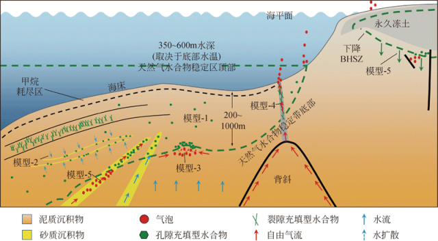 : r9 S, o+ {" v$ M3 I ▲ 海底沉积物体系中五种典型的天然气水合物赋存模式(You et al.,2019)